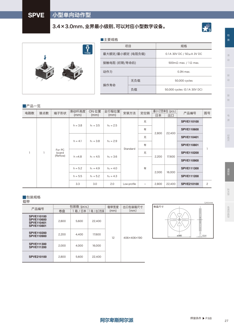 SPVE210100 照片 1 1 For PC board (Reflow) 0.3N max. 3.3 3.0 2.0 Low-profile - 3.4×4.0×1.8mm