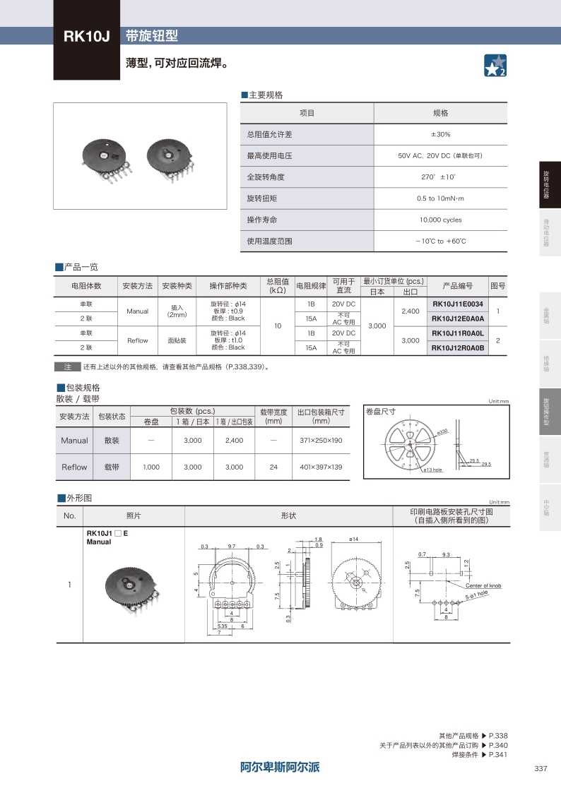 RK10J系列可應(yīng)對(duì)各種回流焊,浸焊的薄型。型:帶旋鈕型 ? 外形尺寸:10型 ? 電阻體數(shù):單聯(lián),2聯(lián) ? 附屬開關(guān):無。