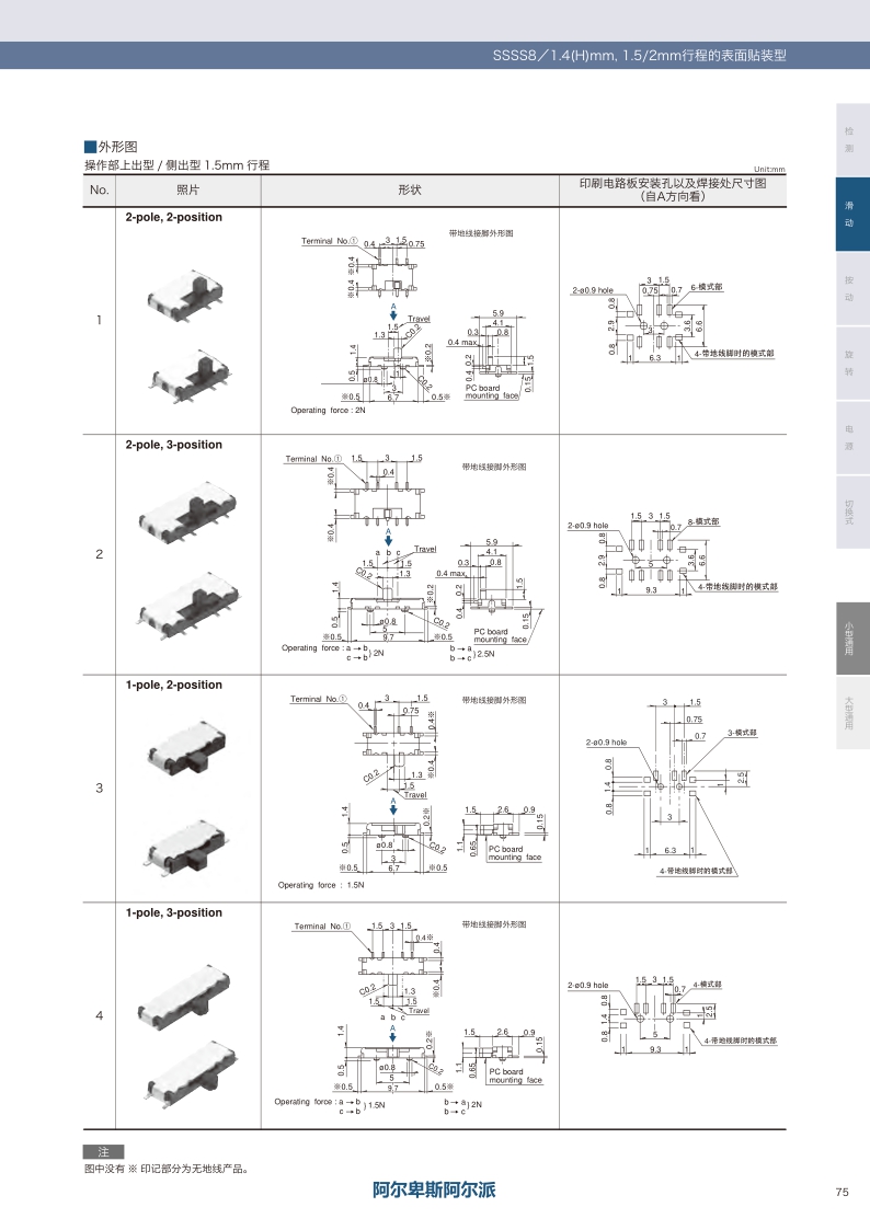 本體高度1.4mm的薄型滑動(dòng)開關(guān),操作方向:Vertical Horizontal ? 安裝高度:1.4mm ? 行程:1.5/2.0mm ? 最大額定值:0.3A 5V DC ? 電路數(shù):1/2-poles。
