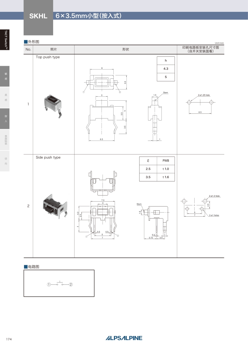 為高密度貼裝做出貢獻的頂推型和側推型兩種型號。操作感覺:敏感 ? 貼裝方式:按入 ? 尺寸(W×D×H):Top push : 6.0×3.5×4.3/5.0mm Side push : 7.3×7.22×4.3mm。