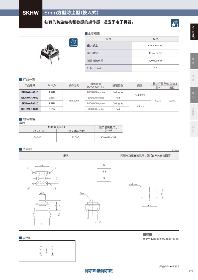 獨(dú)有的防塵結(jié)構(gòu)和敏感的操作感 適應(yīng)于電子機(jī)器。操作感覺:敏感 ? 貼裝方式:按入 ? 尺寸(W×D×H):□6.0×4.3/5.0mm ? 特長:防塵型。
