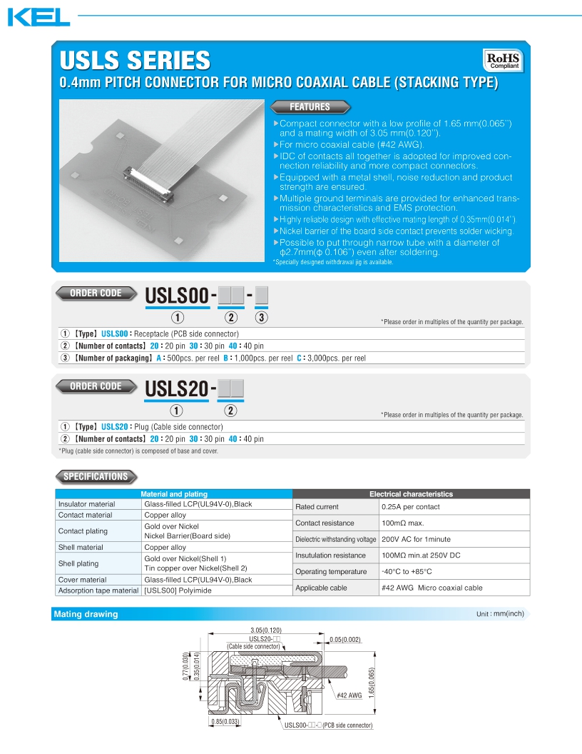USLS系列采用0.4mm間距設(shè)計(jì),壓接連接器,超細(xì)同軸電纜(AWG#42)型,堆疊連接類型,受體(底板側(cè)連接器)。