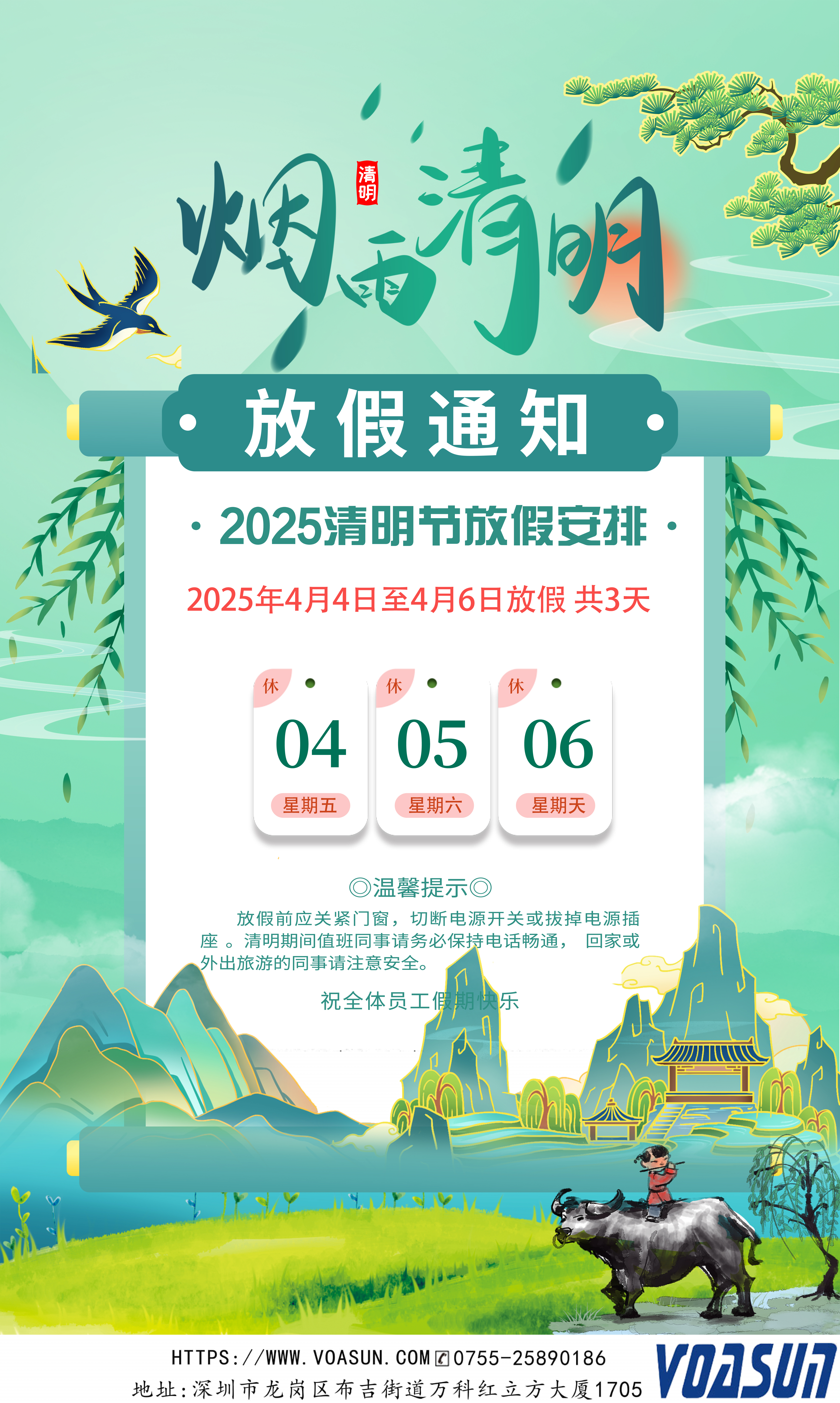 根據(jù)國家及公司相關規(guī)定,2025年清明節(jié)放假及調(diào)班安排:4月4日、5日、6日放假,共3天;不調(diào)班。